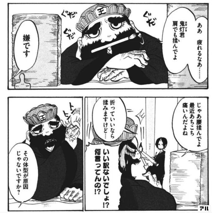 ぐやああ 疲れるなあ じゃあ腰操んでよ最近あちこち痛いんだよね鬼灯君肩でも採んでよ折っていいなら採みますけど いい訳ないでしょ何言ってんのf嫌ですその体型が原因じゃないですか 鬼灯の冷徹 鬼灯 アル